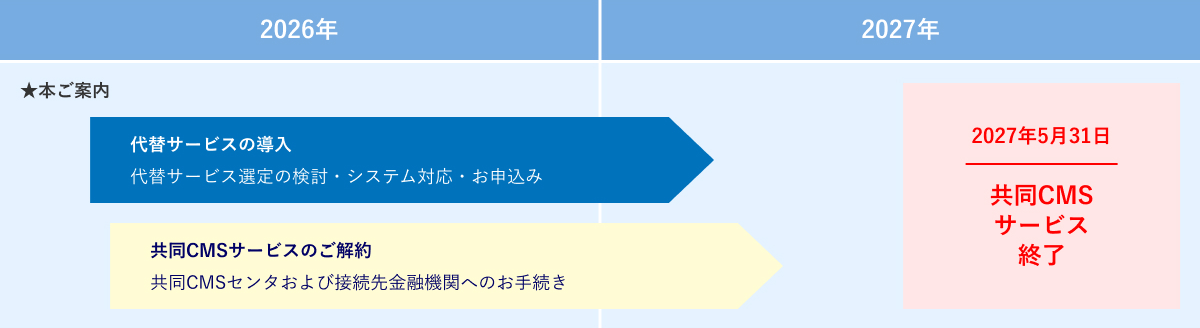期限までに共同CMSへの解約申込が行われない場合であっても、本サービス終了に伴い、金融機関からの依頼に基づき共同CMSにおいて解約処理を行う場合があります。