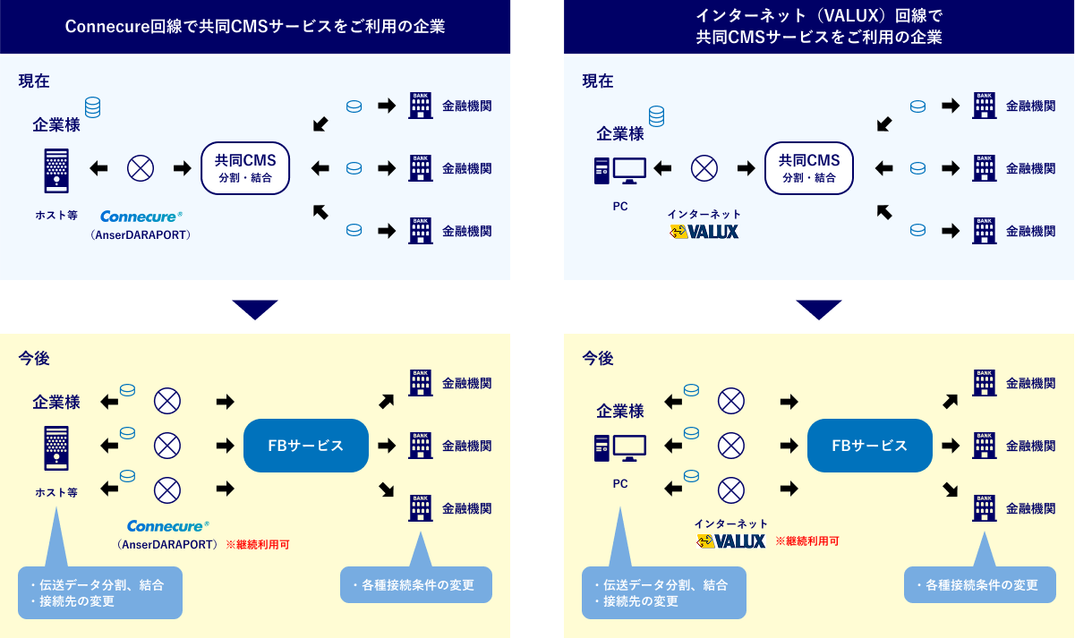 ・原則として、共同CMSサービスでご利用中の接続回線*は継続ご利用いただけますが、接続先の変更が必要な場合がありますので、詳細は金融機関へご確認ください。